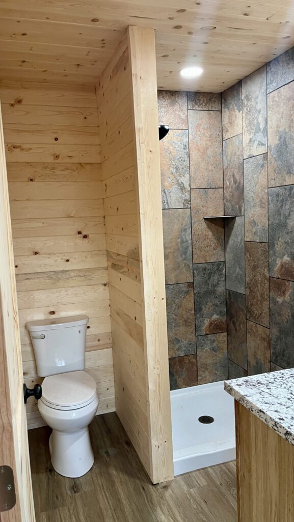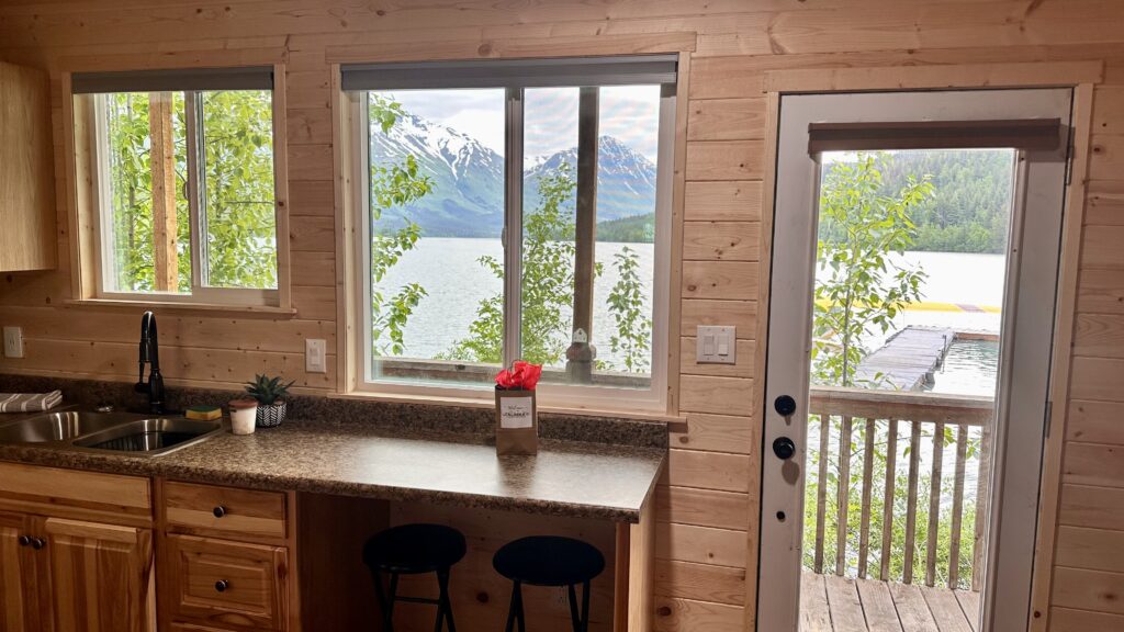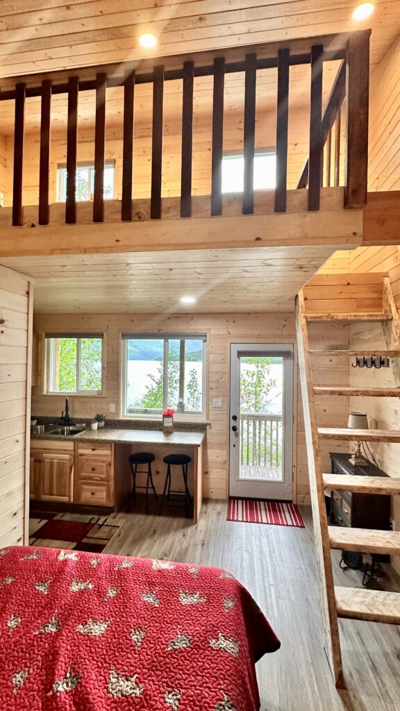 Our Lakeside Cabin includes a Queen bed and a Loft with two twin beds. With a gorgeous view of Upper Trail Lake, a full bathroom and mini kitchenette you will feel right at home.